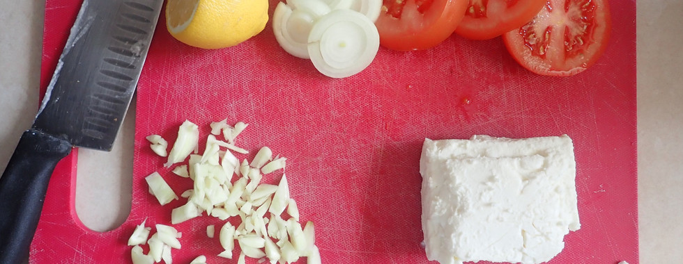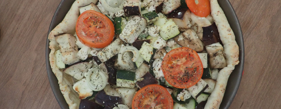 5) Place aubergine and courgette in a colander and rinse thoroughly. Place in a clean bowl and toss with feta, garlic, olive oil, thyme, lemon juice and then spread evenly over the bottom of the pastry. Place tomato and onion slices over the top and bake at 180°C for 20-30 minutes, until the crust is golden brown and the veg is tender.