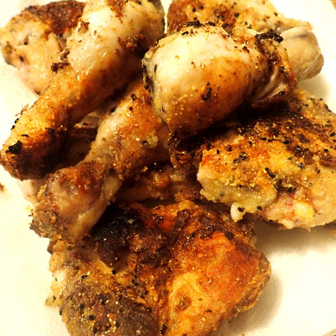 5) Heat oil in a skillet until shimmering. Place 4 pieces of chicken in the pan. Cover for five minutes, then when the chicken is turning golden brown, turn and cover again for 5 minutes. Remove the cover and continue cooking, turning occasionally, until the chicken is cooked through and crispy on the outside.
