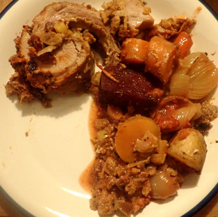 To round off this challenge, we had an old favourite that I grew up with, a Turkish meal called Imam Bayildi. Another old favourite was Bacon and lentil soup, which is dead simple but oh! so satisfying. We tried a new twist on porridge, adding persimmons to it, and trialled cauliflower steaks for the first time. I have been meaning to try these for years and am so glad that we did! American Thanksgiving fell on Day 97 of the Challenge, and while we didn't do a full Thanksgiving dinner (not living in the US we need to find another time for it), but I did try a new twist on Pumpkin pie, swirling rosehip purée through it. Another very tasty meal was beetroot pasta with broccoli sauce topped with garlic shrimp. And then finally, for Day 100, we had a roast for dinner, and I tried a new stuffing, Fenugreek Orange Stuffing, that I had the idea for ages ago and have wanted to try for a couple of months. So very tasty and a good way to round off the challenge.