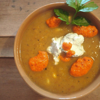 Sweet Potato Soup with Creamy Fromage Blanc and Spicy Red Pepper Paste