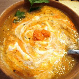7) Serve the soup hot, with dolloping options of fresh cheese and red pepper paste.