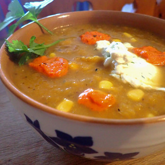 4) Using a hand blender, blitz soup until it is most of the way smooth. Add corn, Urfa and nigella seeds.